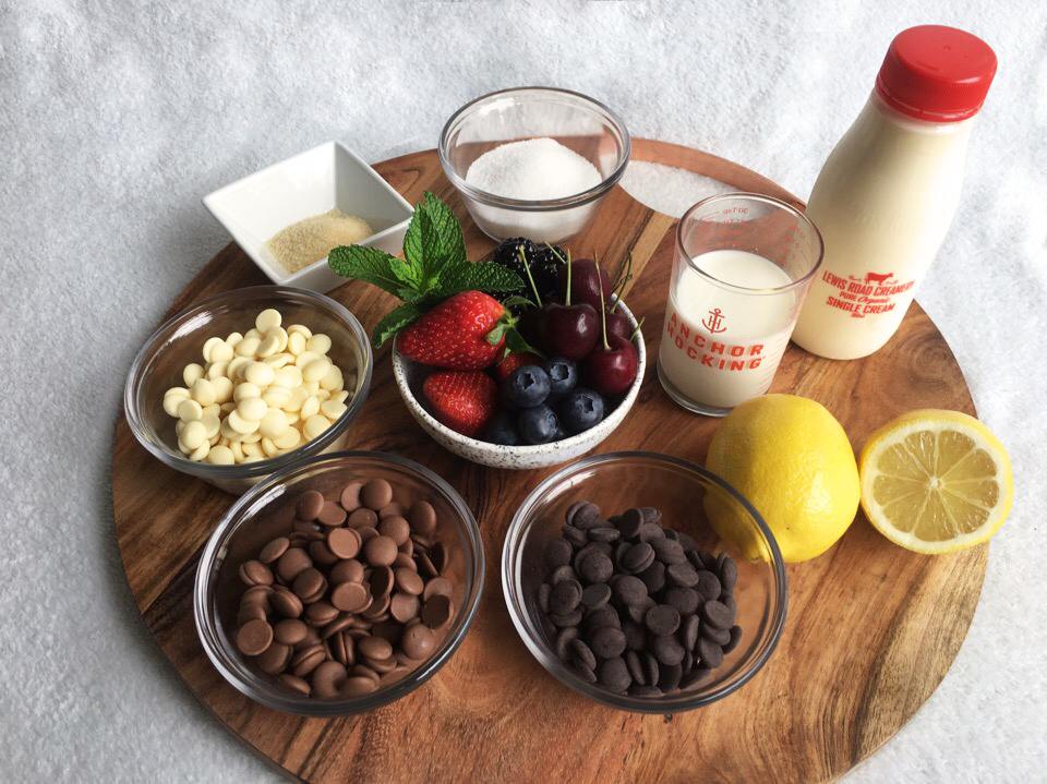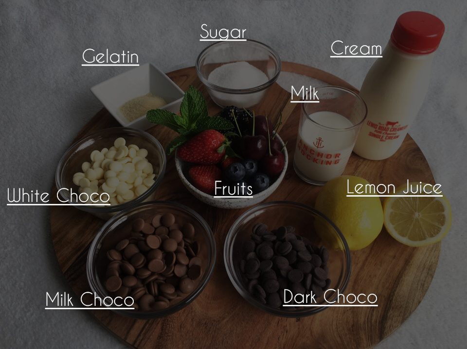 Cream, dark chocolate, sugar, salt, milk, coffee, flour, butter, eggs, gelatine, lemon juice, baking powder, baking soda, food grade colourings.